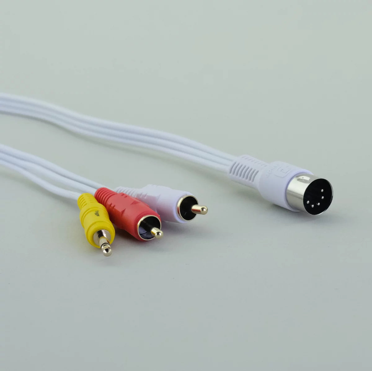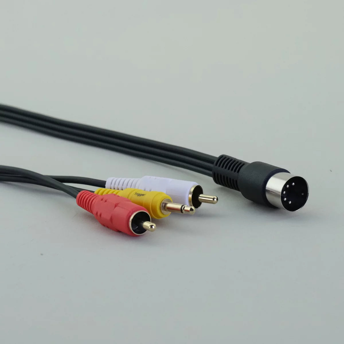 B&O-yhteensopiva DIN5–RCA-adapteri, jossa 3,5 mm trigger. Laadukas ratkaisu aktiivikaiuttimien liittämiseen muihin äänilähteisiin.
