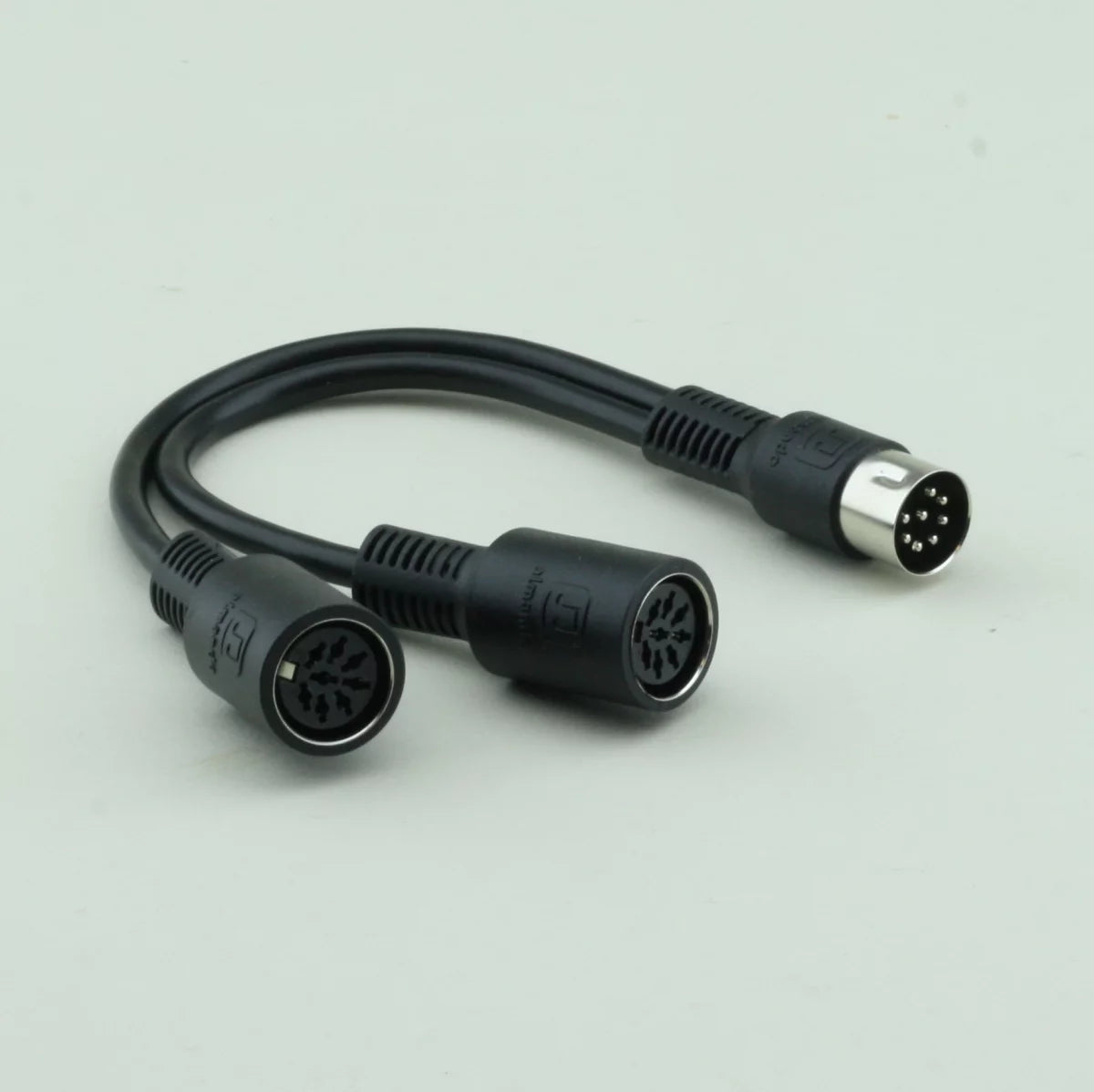 Täyskytketty Powerlink MKII -haaroitin: yksi DIN8-uros → kaksi DIN8-naarasliitäntää – jaa signaali kahdelle kaiuttimelle luotettavasti ja siististi.