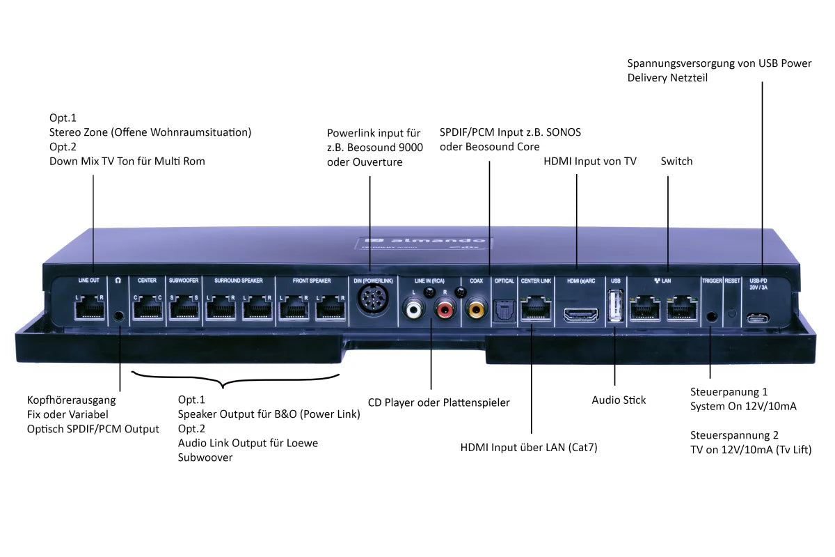 Voit yhdistää kaiuttimet Powerlink-, RCA- tai digitaalisilla liitännöillä. Sopii täydellisesti myös Beolab-kaiuttimien ohjaukseen (esim. Beolab 5, 28, 50).
