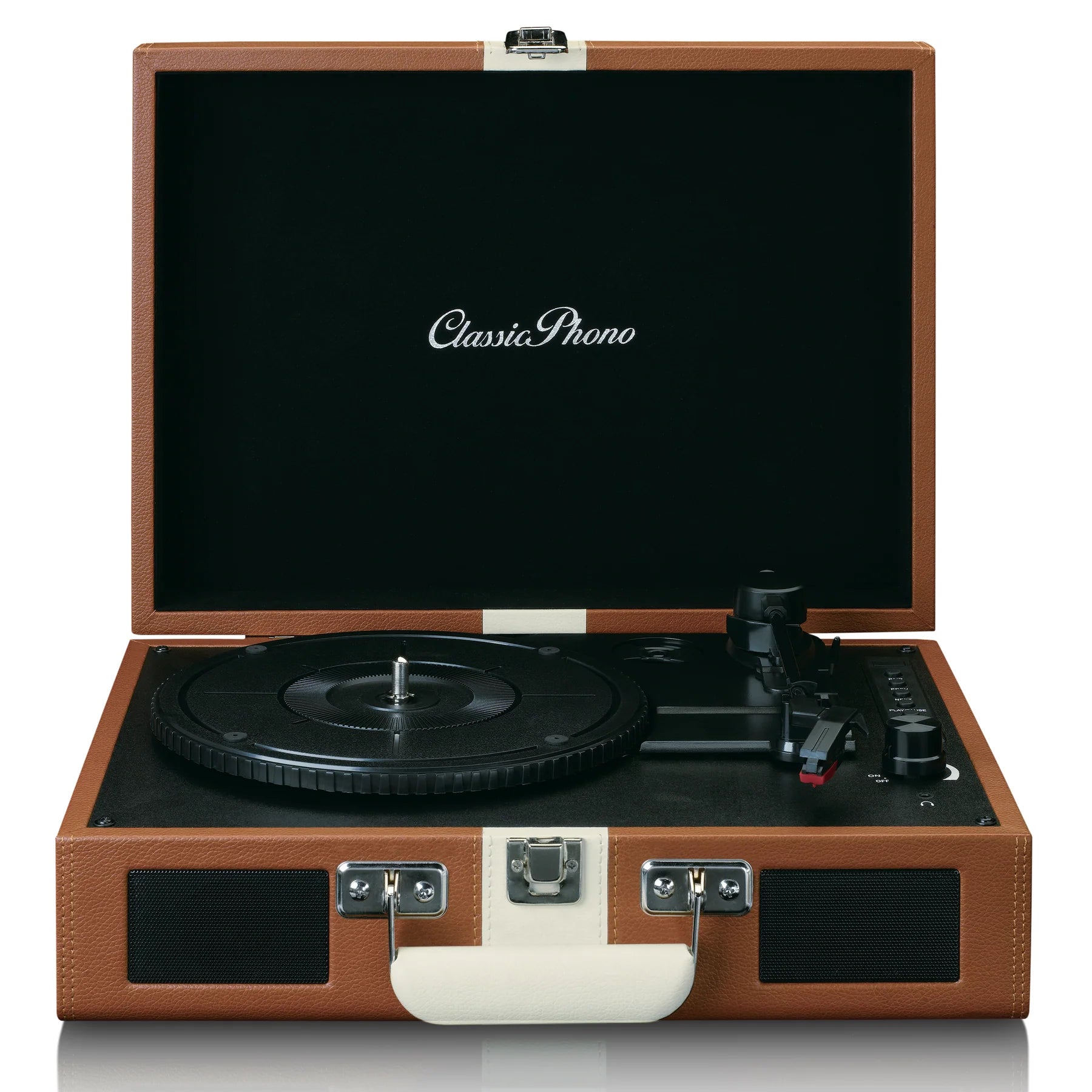 Soitin sisältää RCA-lähtöliitännän, kuulokelähdön sekä AUX-tulon, joten voit liittää sen muihin äänentoistolaitteisiin tai käyttää sitä kuulokkeiden kanssa. MDF-runko keinonahkapäällysteellä viimeistelee vintage-ilmeen, tehden soittimesta todellisen sisustuselementin.