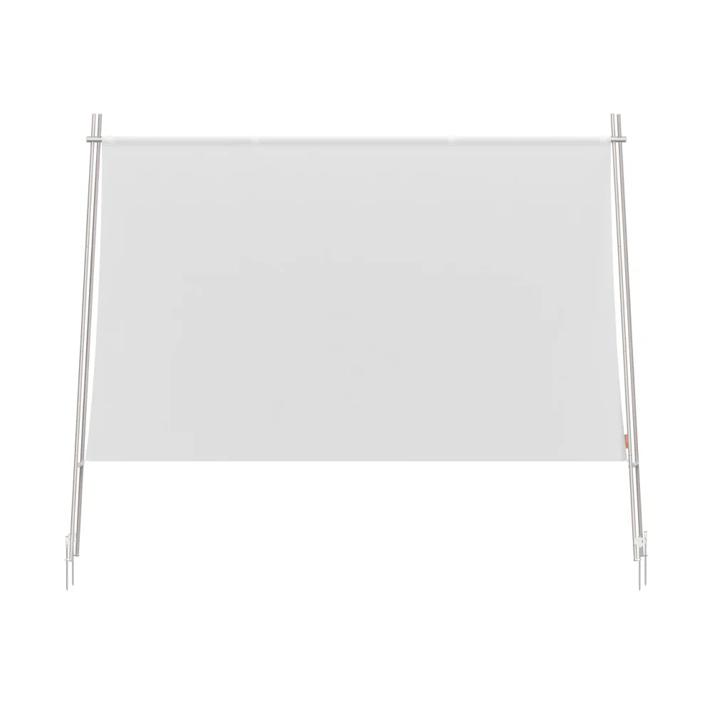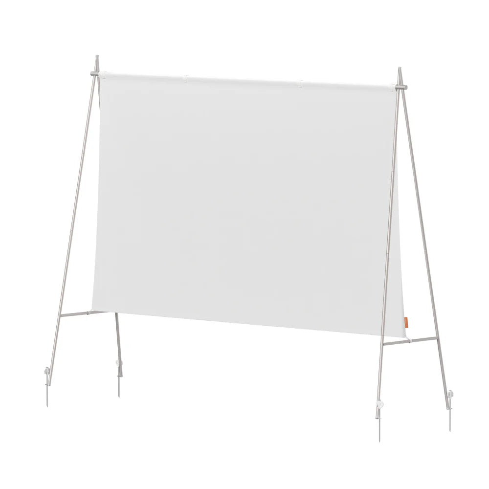 Valkokangas toimitetaan maapiikeillä ja tukevalla jalustalla varustettuna. Nämä varmistavat vakaan pystytyksen erilaisilla alustoilla, kuten nurmikolla tai terassilla.